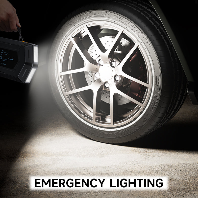 Meet the ultimate all-in-one roadside companion. This professional-grade jump starter packs a powerful 2400A peak current, a digital air compressor, a high-speed USB power bank, and a multi-mode LED flashlight — all in one rugged, compact unit.