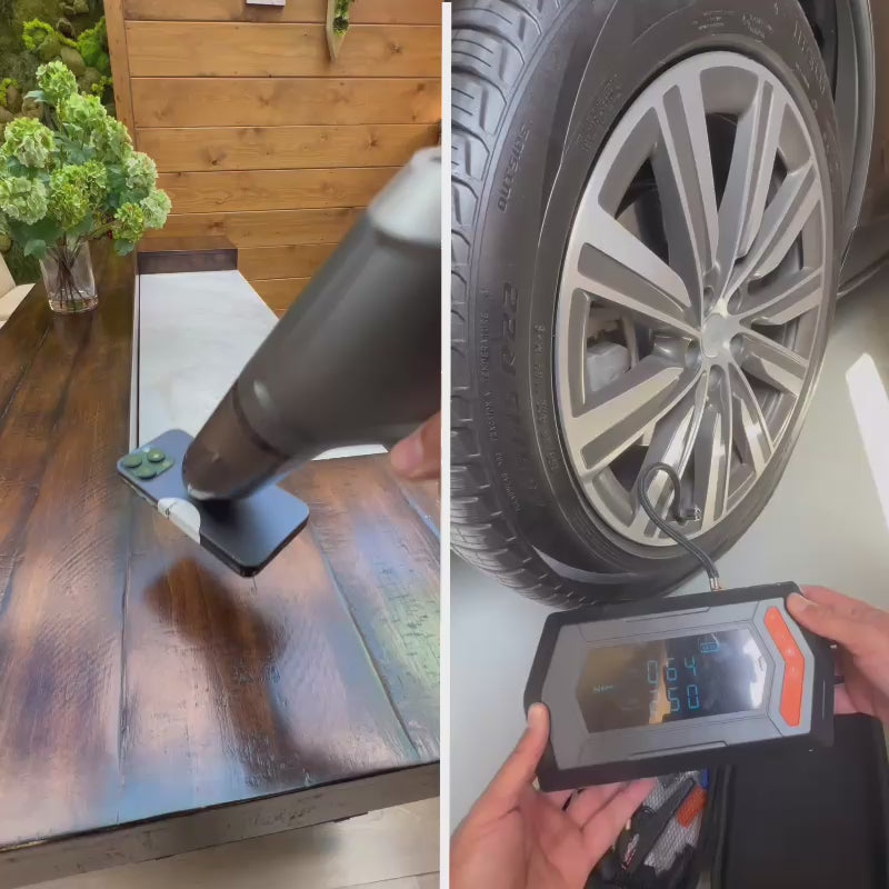 • جمب ستارت لتشغيل السيارة + كمبروسر نفخ الإطارات، وشحن أجهزتك في ثوانٍ.