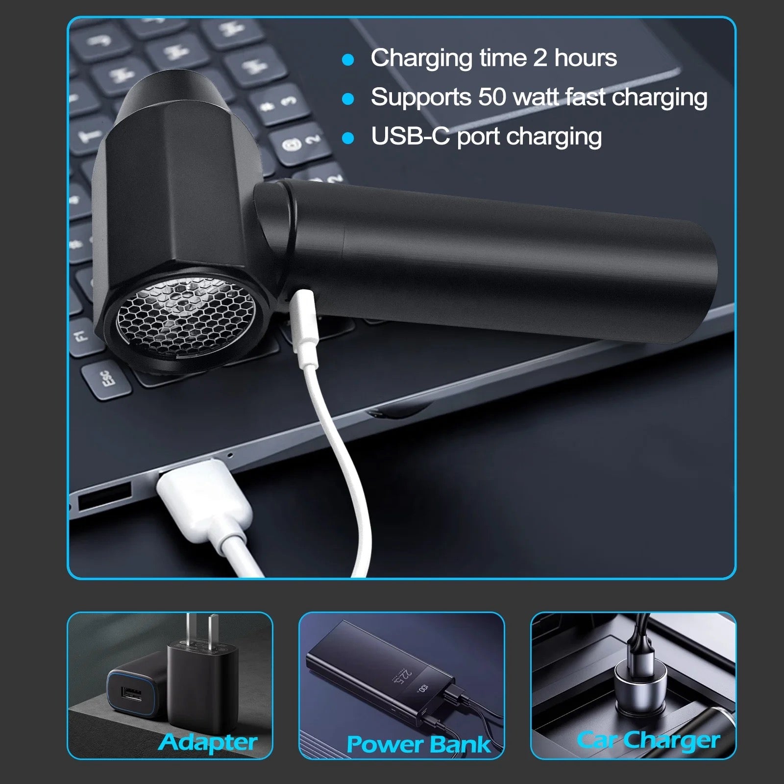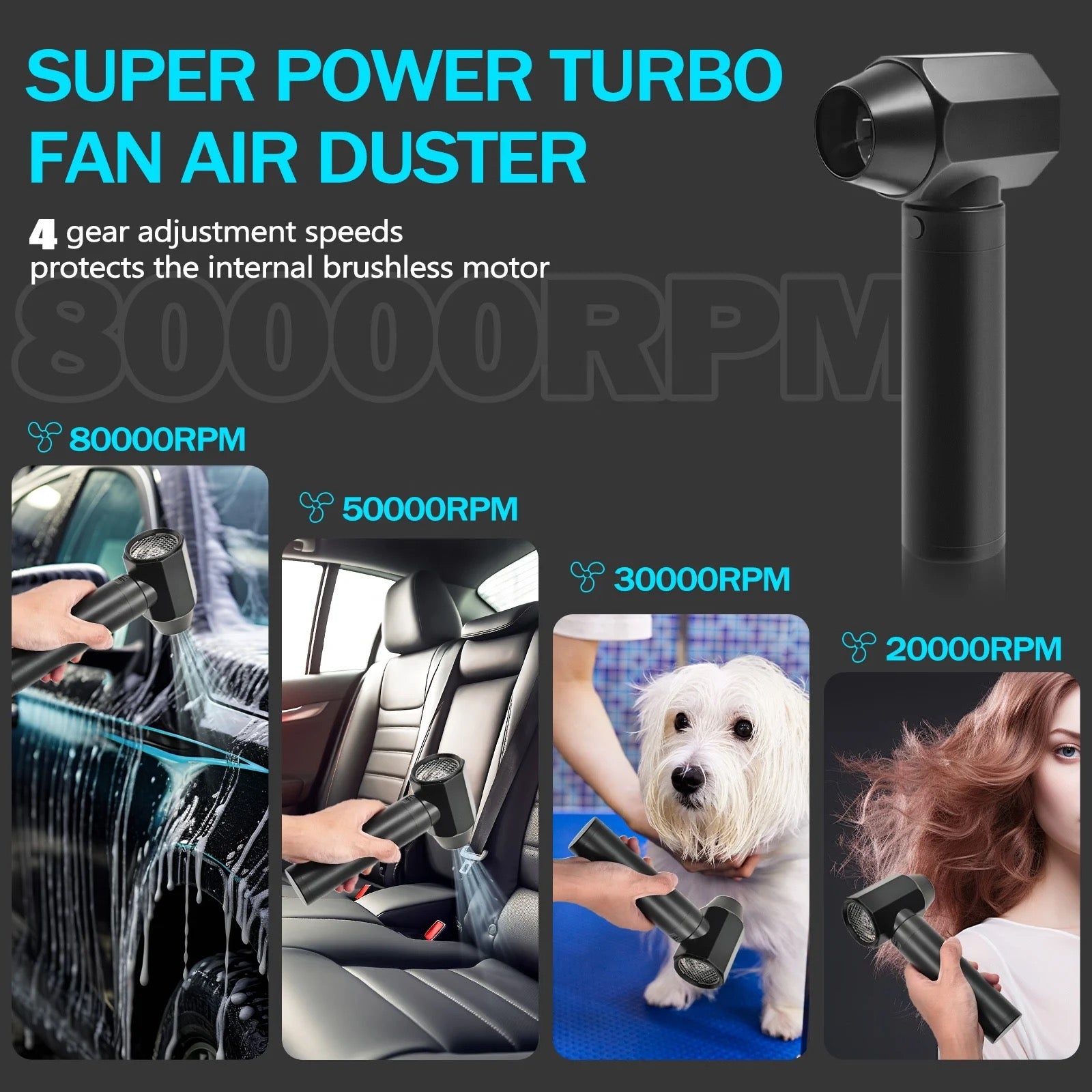 Introducing our 60m/s super power turbo fan – the rechargeable alternative to air dusters, running for a solid 2 hours! Compact, cordless, and powerful, it's your ultimate airflow companion. Experience efficient cleaning and cooling with ease